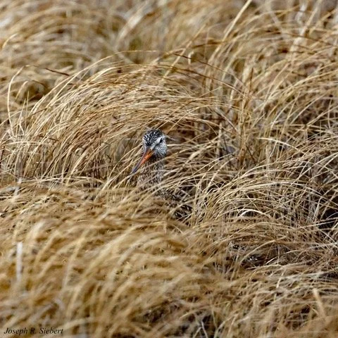 “In May and June, my wife Linda and I participated in a birding tour of Manitoba,” Joe says. “Most days we saw Godwits wading in shallow water, but on one occasion, we spotted one hidden deep in the dried grasses next to a marsh. This view was a bit different, as it obscured much of the bird’s body, but it caught some of the mystery of the tundra. Look carefully, the bird seemed to say!”